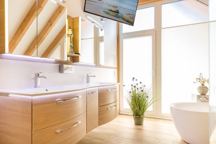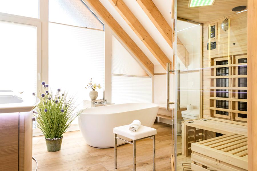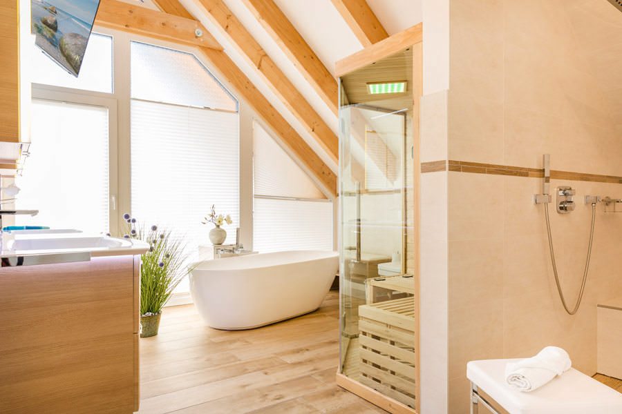 Die beiden hochwertigen Tageslicht-Bäder mit Fußbodenheizung sowie ein Gäste-WC sorgen dafür, dass es zu keinem morgendlichen Stau kommt. Das große Bad ist ausgestattet mit einem doppelten Waschtisch und Spiegelschrank, einer Walk-In-Dusche mit zusätzlicher Regendusche, einer freistehenden Badewanne, WC, Handtuchtrockner und Fön. Wer sich in der Badewanne längere Zeit entspannen will, wird sich sicherlich über den 55 Zoll Flachbild-Smart-TV (4K) freuen. Ein weiteres Hightlight vor allem für die kühle Jahreszeit ist die Vollspektrum-Infrarotkabine.