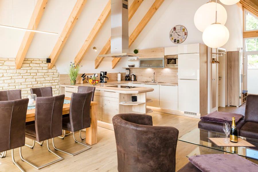 Im angrenzenden Essbereich haben bis zu 8 Personen auf bequemen Schwingstühlen ausreichend Platz.
