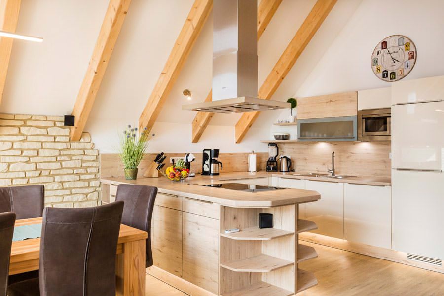 Die perfekt geplante Markenküche lädt zum gemeinsamen Kochen mit Familie und Freunden ein. Zur Ausstattung gehören ein großer Kühlschrank mit Gefrierteil, ein Geschirrspüler, ein Backofen, ein Induktionskochfeld in Übergröße sowie eine Mikrowelle.